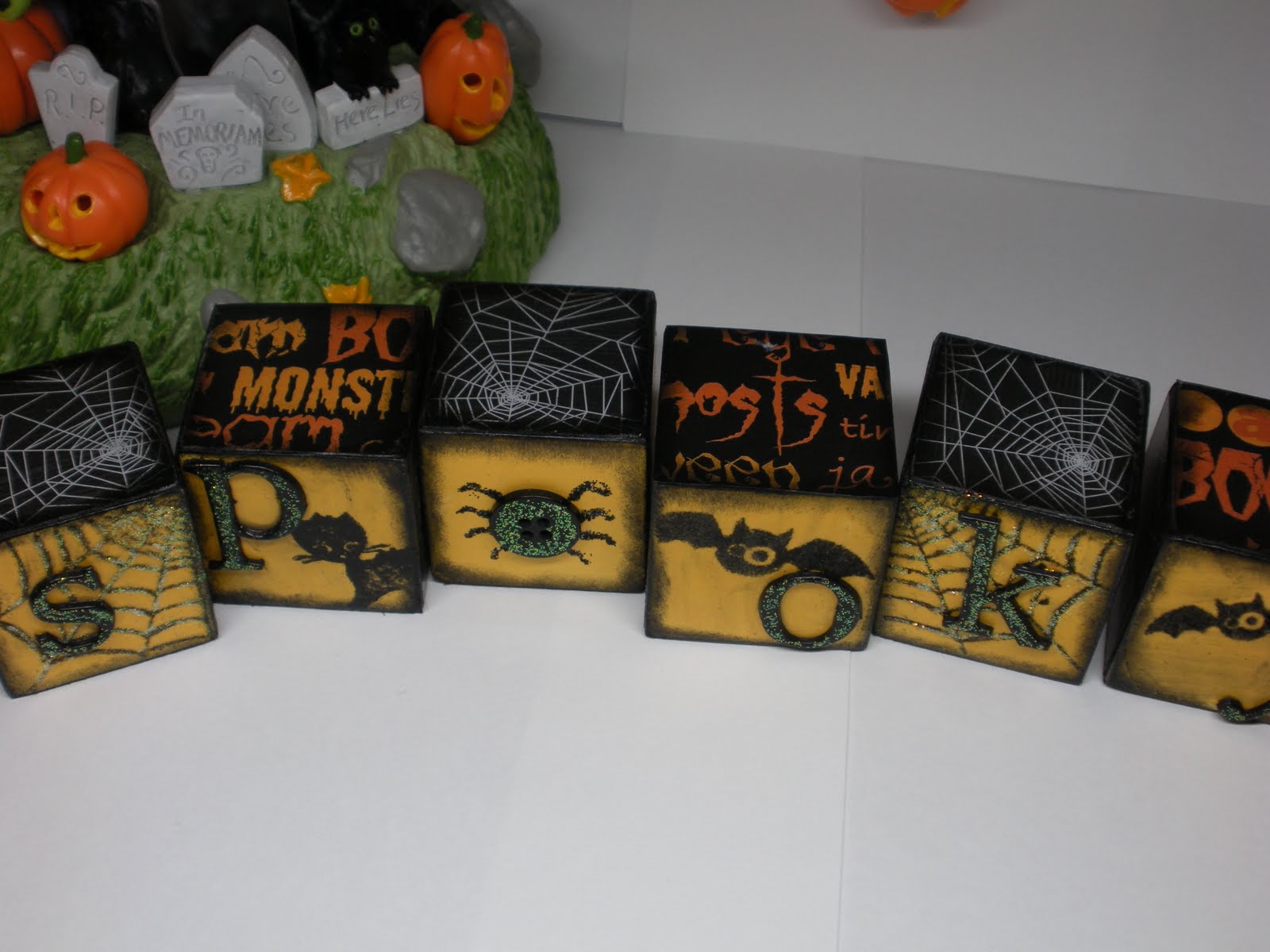 5. The letters are tricky. I cut out the letters using my Slice and Spook Alley design card. Then I traced the letters on the blocks in pencil. I used a black paint pen to fill it in.